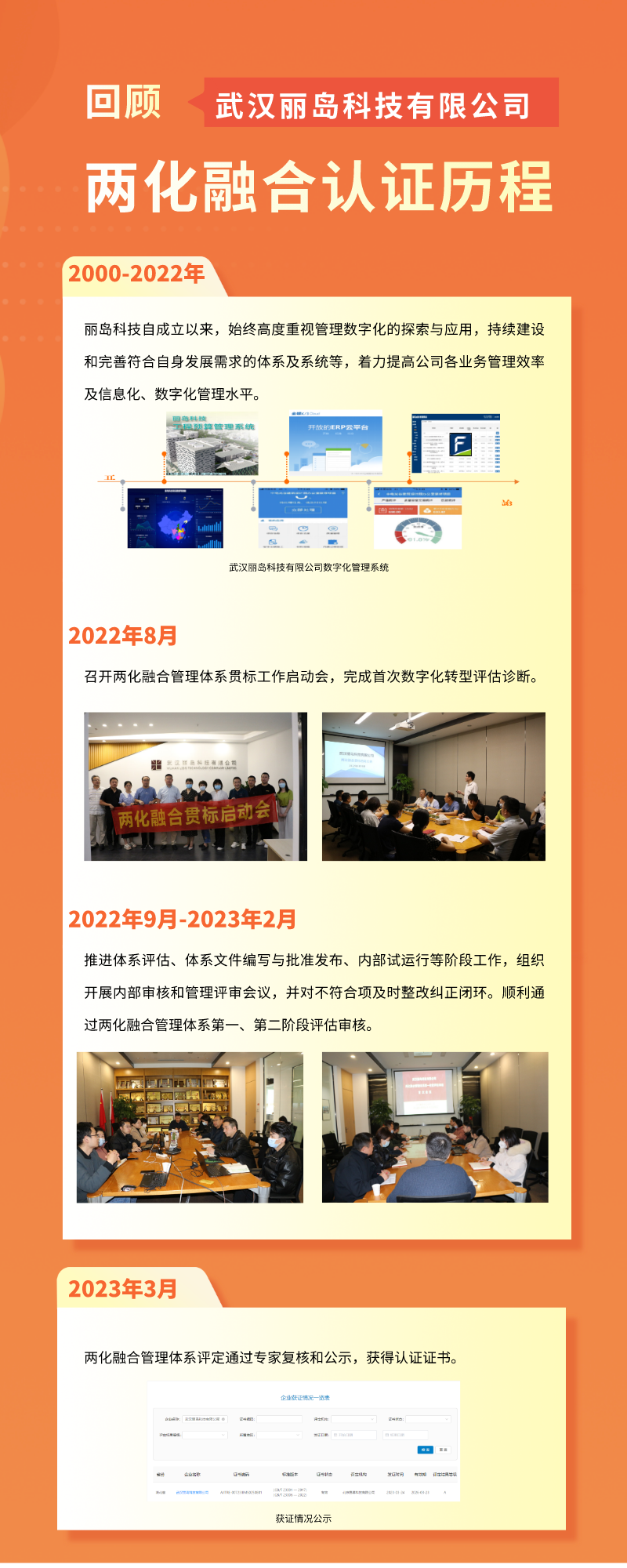 ? ?近日,武漢麗島科技有限公司順利通過《信息化和工業化融合管理體系要求》(GB/T 23001-2017)及《信息化和工業化融合管理體系新型能力分級要求》(GB/T 23006-2022)認證審核,榮獲A級兩化融合管理體系評定證書,標志公司數字化轉型邁上新臺階。
